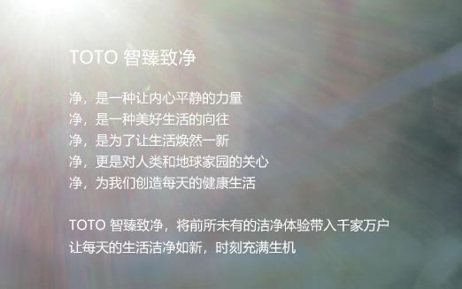 Green Challenge,TOTO新环保愿景确立。TOTO不断地推出节能、环保产品。开发出WASHLET产品后,TOTO开始通过引进高端的标准厨房用品,将其先进的技术投向其它产品领域。